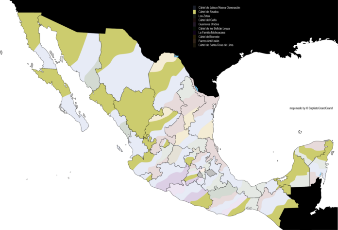 Yellow-Green = Location of the Sinaloa Cartel in Mexico