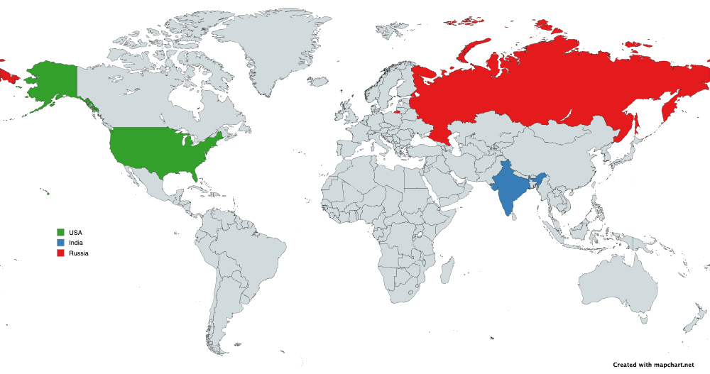 World map highlighting the United States in green, Russia in red, and India in blue, reflecting the trade and energy shift as India agrees to stop buying Russian oil under a new US–India tariff deal.